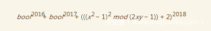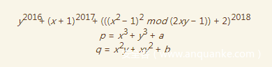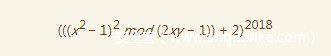 assert gmpy.is_prime(y) ** 2016 + gmpy.is_prime(x+1) ** 2017 + ((x**2 - 1)**2 % (2*x*y - 1) + 2) ** 2018 == 30097557298197417800049182668952226601954645169633891463401117760245367082644152355564014438095421962150109895432272944128252155287648477680131934943095113263121691874508742328500559321036238322775864636883202538152031804102118831278605474474352011895348919417742923873371980983336517409056008233804190890418285814476821890492630167665485823056526646050928460488168341721716361299816947722947465808004305806687049198633489997459201469227952552870291934919760829984421958853221330987033580524592596407485826446284220272614663464267135596497185086055090126893989371261962903295313304735911034185619611156742146