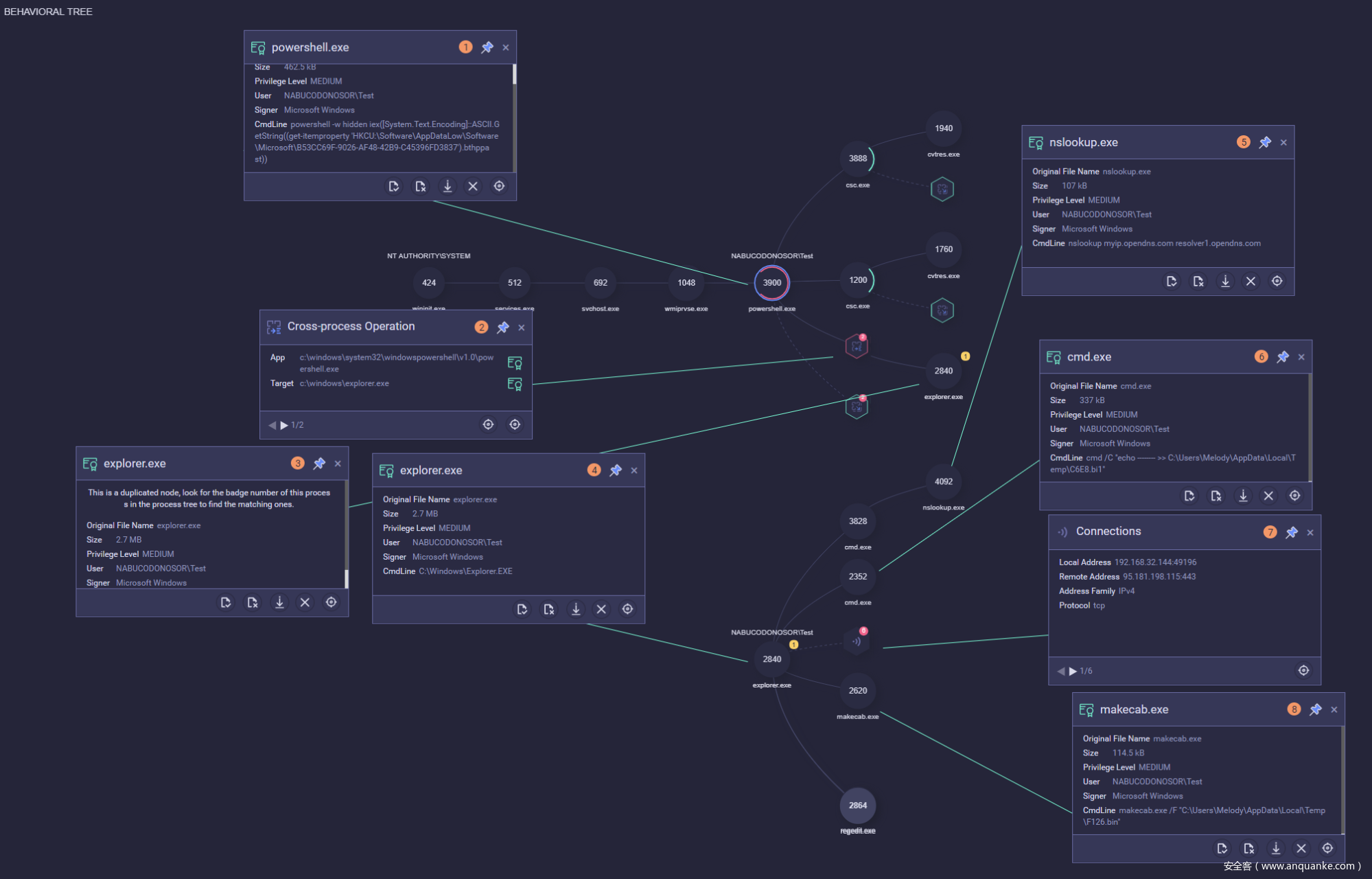 当Ursnif执行cmd.exe后,我们可以借助ReaQta-Hive的行为树来观察其活动轨迹: