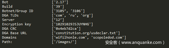 Ursnif可执行文件的配置信息如下所示,从中我们能够提取出各种信息,如:bot版本、botnet ID、DGA(Domain Generation Algorithm,域名生成算法)数据、C2等。