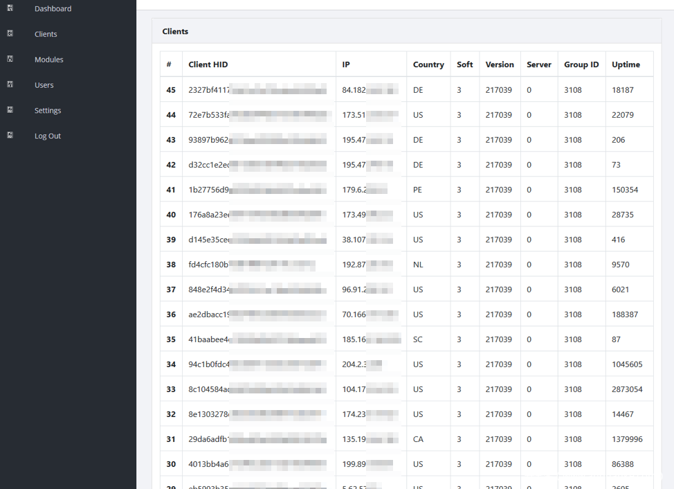 Ursnif会在面板的Clients页面中记录被成功感染的目标。该页面会显示与受害者计算机有关的一些统计信息,包括:IP地址、国别信息、木马版本及其他信息。