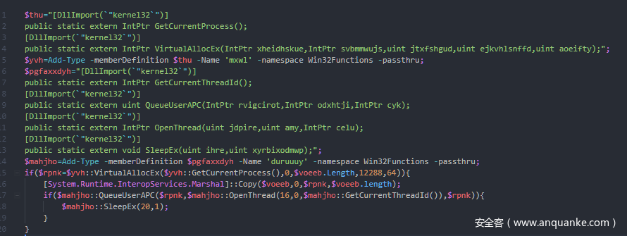 该内容实际上是一个PowerShell脚本,直接在内存中运行。这种无文件攻击方法会根据当前的系统架构选择匹配的.dll文件(Client32或者Client64),将代码注入Explorer中(如N#2分析窗口所示)。
