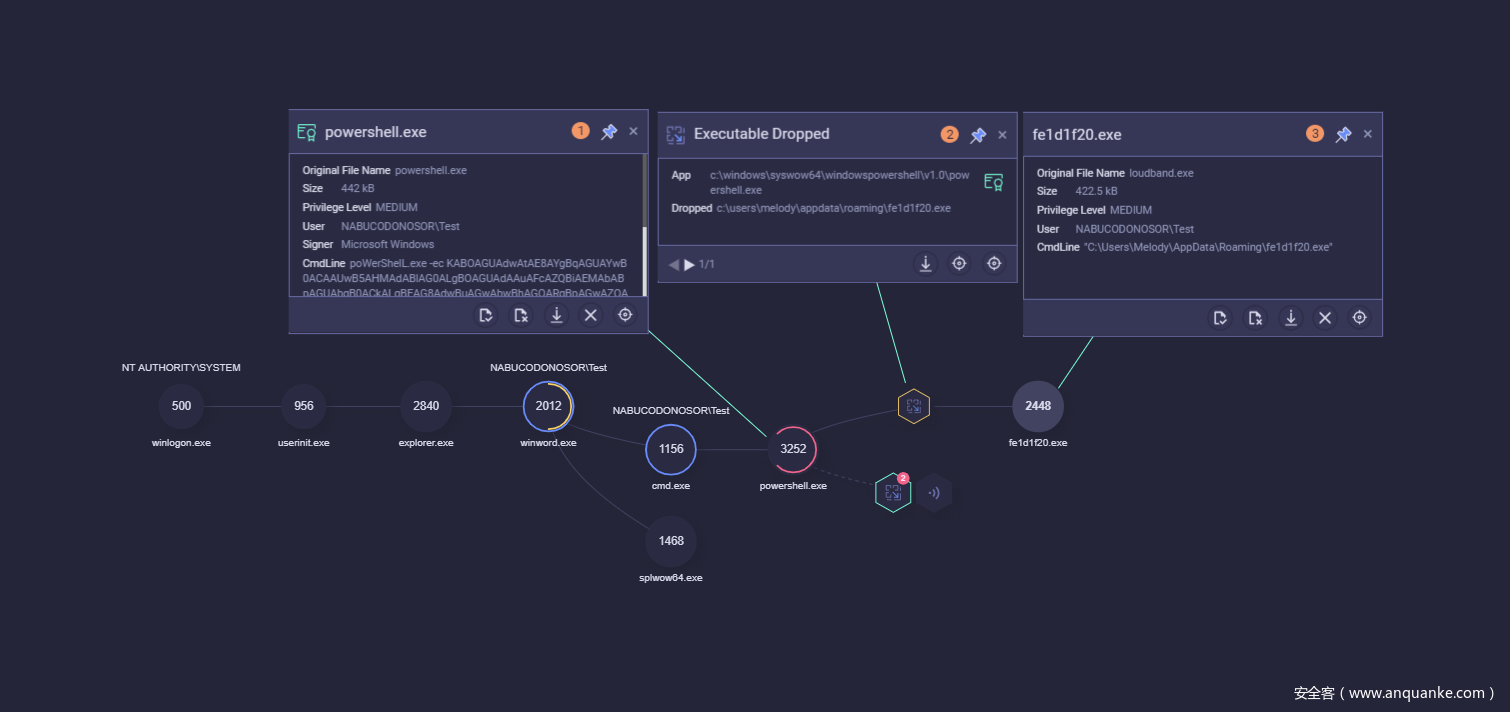 Cmd.exe会生成powershell.exe(1号分析窗口),该进程随后释放并运行另一个可执行文件(2号及3号分析窗口),这个可执行文件就是最终的载荷:Ursnif。当最终载荷被执行后,会创建一个注册表键值,存储下一个感染阶段数据。