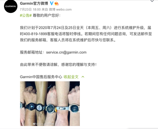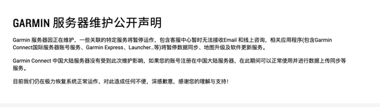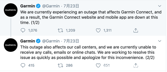 佳明美国账号23号在社交软件发布消息,称佳明服务器停机,Garmin Connect APP受到了影响,并且佳明的通讯系统也瘫痪了,他们无法收到用户的呼叫、邮件和在线咨询。