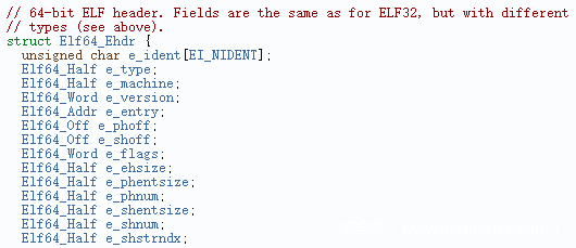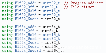通过查看ELF.h文件可以找到ELF文件的数据结构信息,在ELF.h文件中,数据类型主要有以下几种: