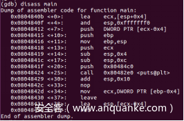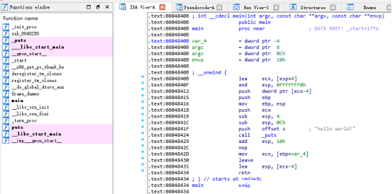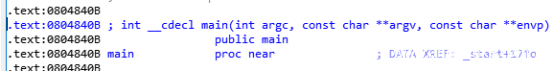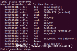 我们看到程序调用了puts库函数做了输出,同时0x804840b即是反汇编代码中对应函数地址;