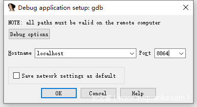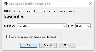 如果是32位系统,则使用ida.exe,在IDA界面中点击:【Debugger】->【Attach】->【Remote GDB debugger】,连接localhost主机的8832端口。
