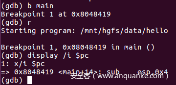 然后通过“b main”、“r”、“display /i $pc”命令运行被调试的程序: