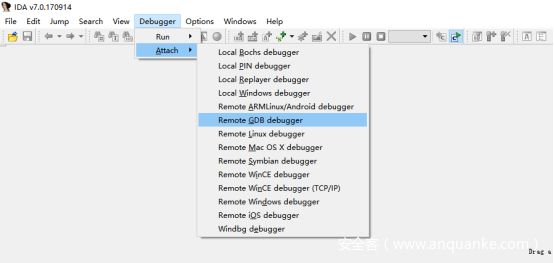 3.在IDA中,选择菜单栏>Debugger>Select a debugger(或者是switch debugger)>选择Remote linux debugger>ok;