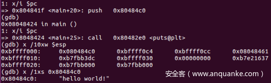 在进入函数前,可以通过“x /10xw $esp”命令查看寄存器信息: