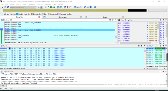 IDA连接成功后,虚拟机系统将中断在内核地址中,此时即可对内核中的恶意程序进行断点调试。