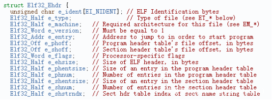ELF目标文件格式的最前部是ELF文件头,它定义了ELF魔数、文件机器字节长度、数据存储方式、版本、运行平台、ABI版本、ELF重定位类型、硬件平台、硬件平台版本、入口地址、程序头入口和长度、段表的位置和长度、段的数量。