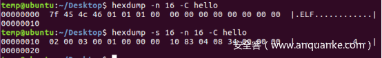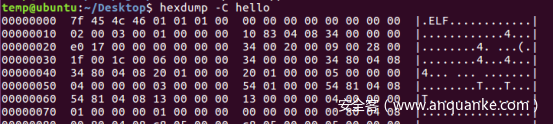 查看Linux样本的16进制数据,可以使用“hexdump”工具: