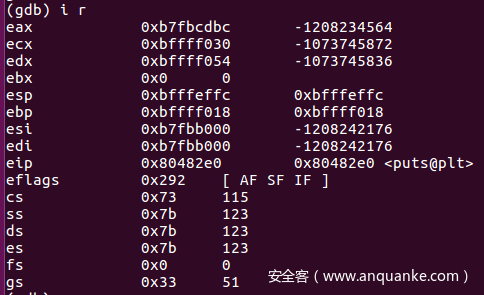 在调试过程中,通过执行“i r”命令获取寄存器信息: