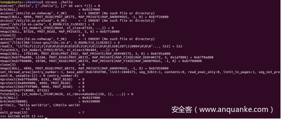 我们看到程序调用write()系统调用做了输出,同时strace还把程序运行时所做的系统调用都打印出来了。