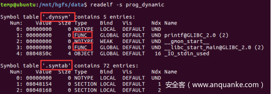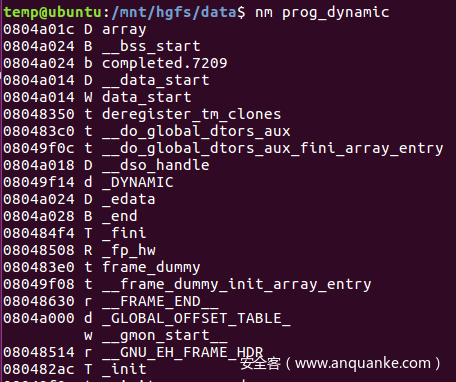 “nm”命令可以用来列出目标文件的符号清单(.dynsym节、.symtab节)。