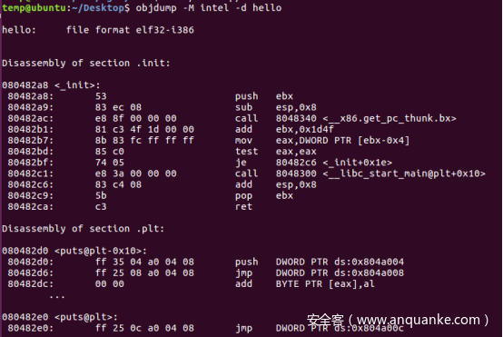 分析Linux样本的反汇编代码,最常见的分析工具是IDA,如果Linux样本代码比较简单,也可以使用“objdump”工具: