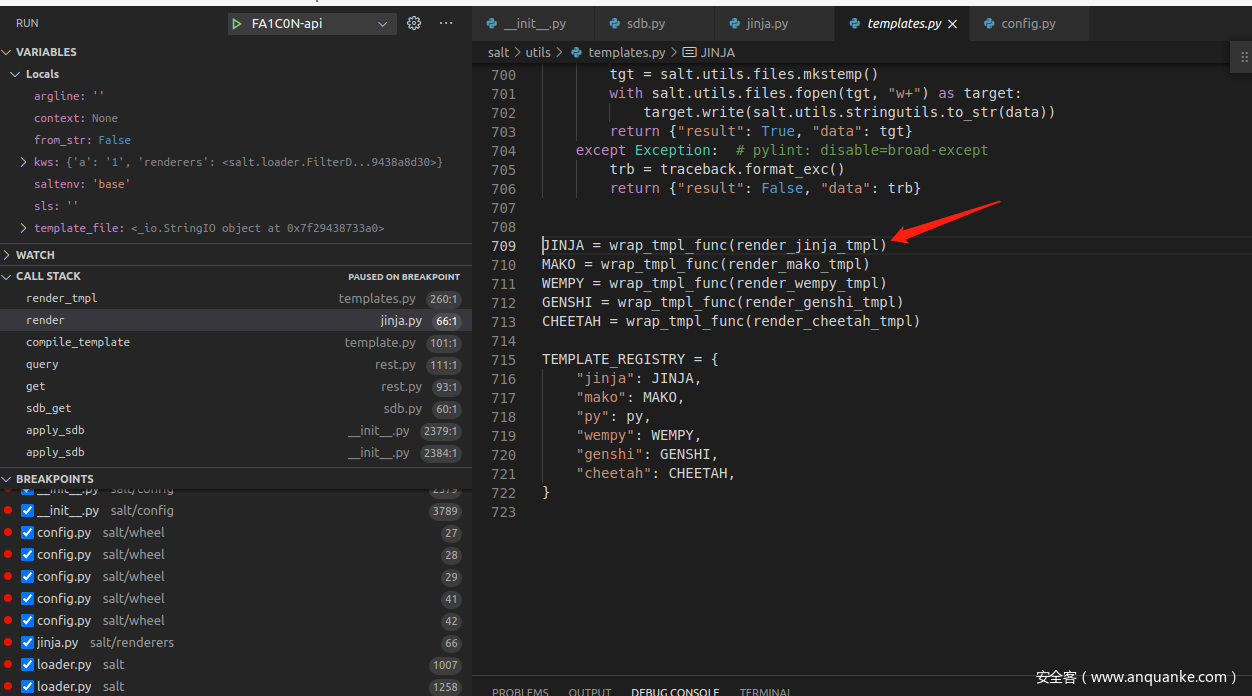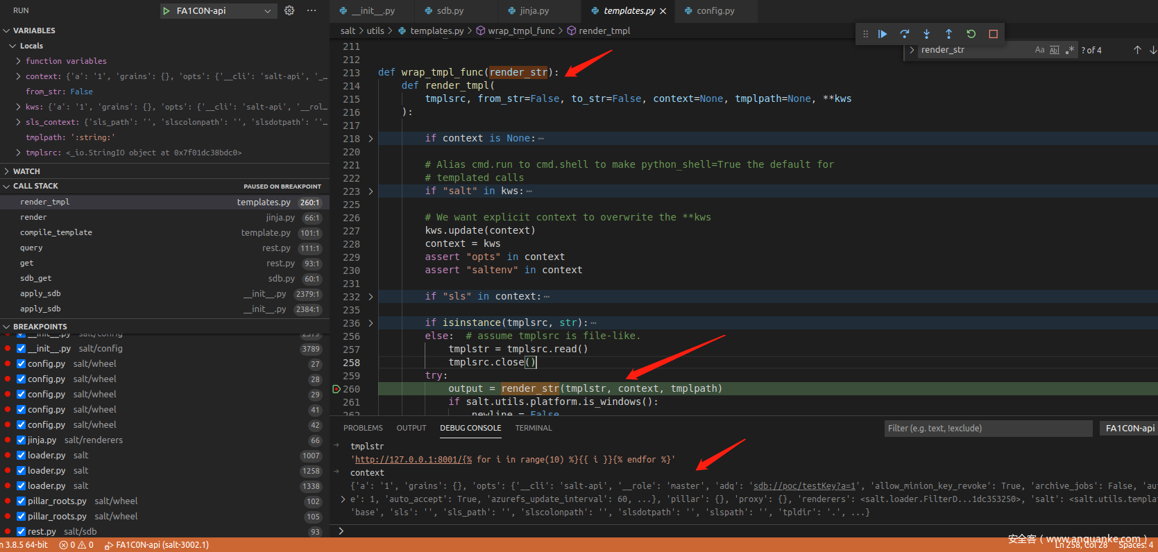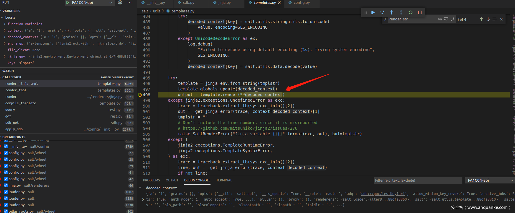 跟进render_jinja_tmpl,成功抵达template.render函数,jinja2模板渲染!梦开始的地方!