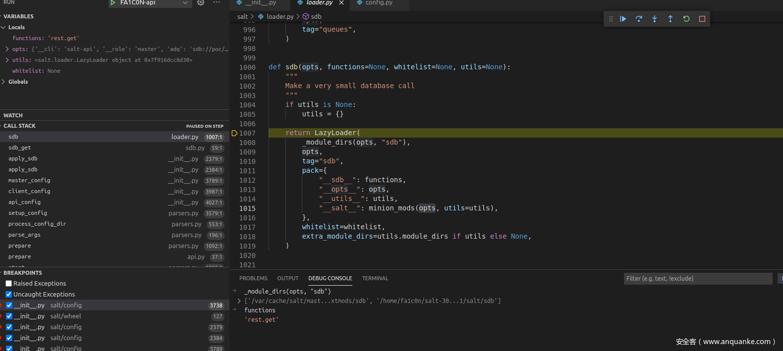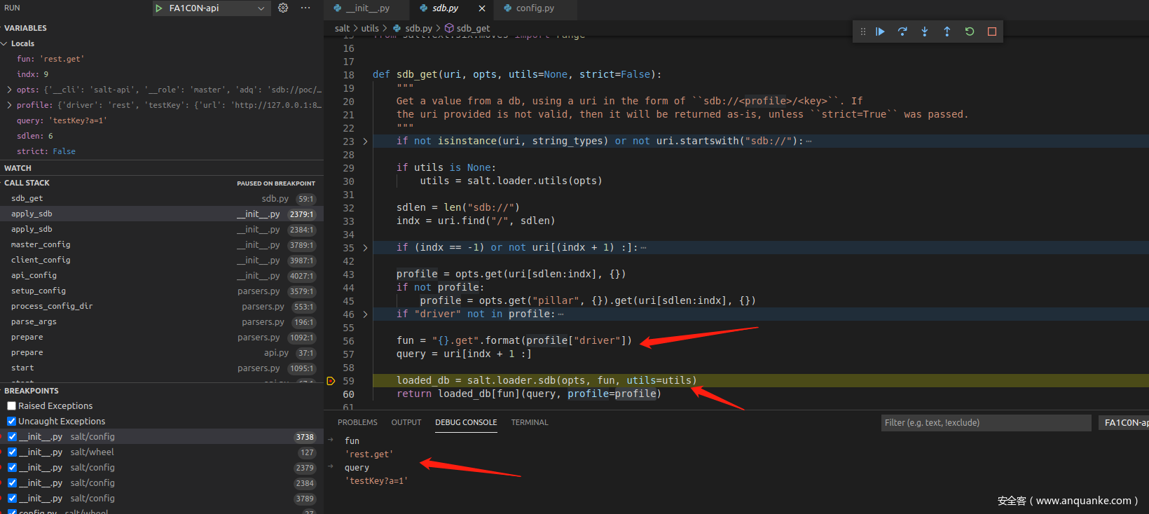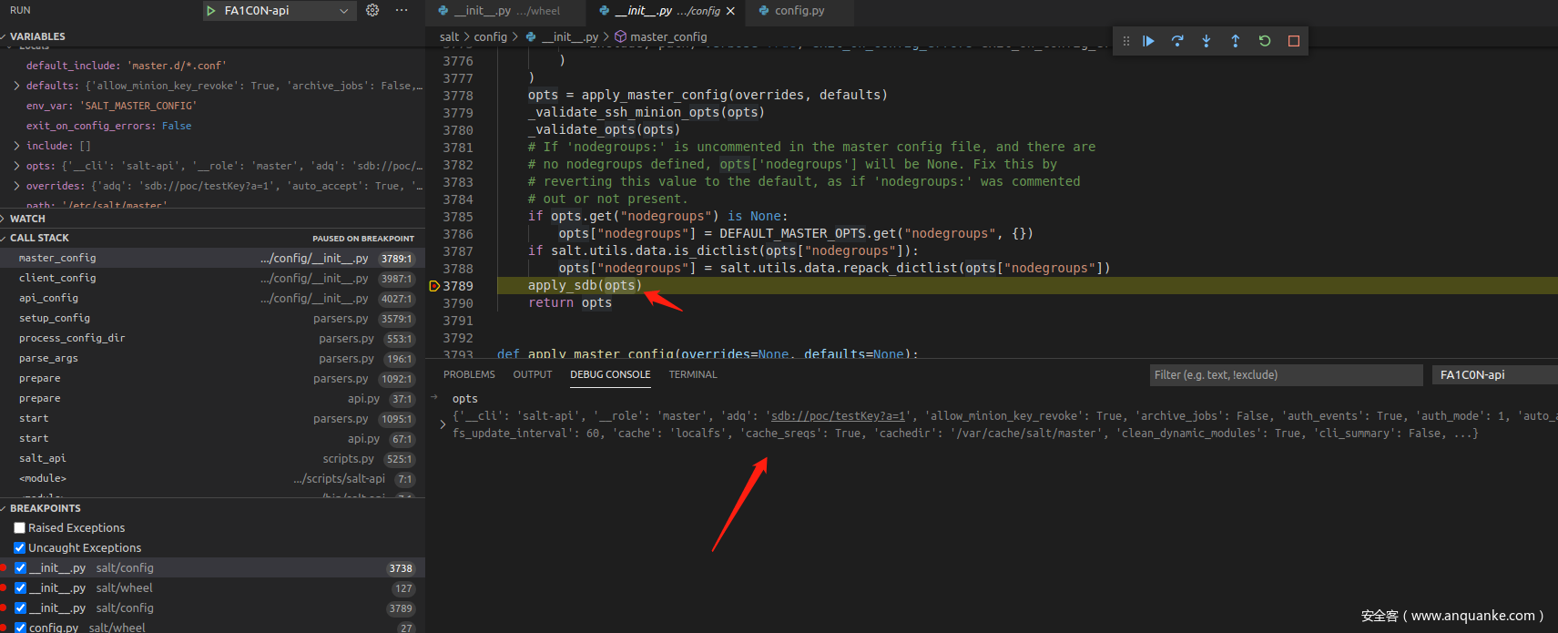 在salt/config/init.py的master_config函数的apply_sdb位置下断点,重启salt-api,断到,get it! 假装此时我们是发送了config.apply才断到了master_config函数,opts里的值就是我们用上面的未授权写入的配置文件,跟进apply_sdb函数