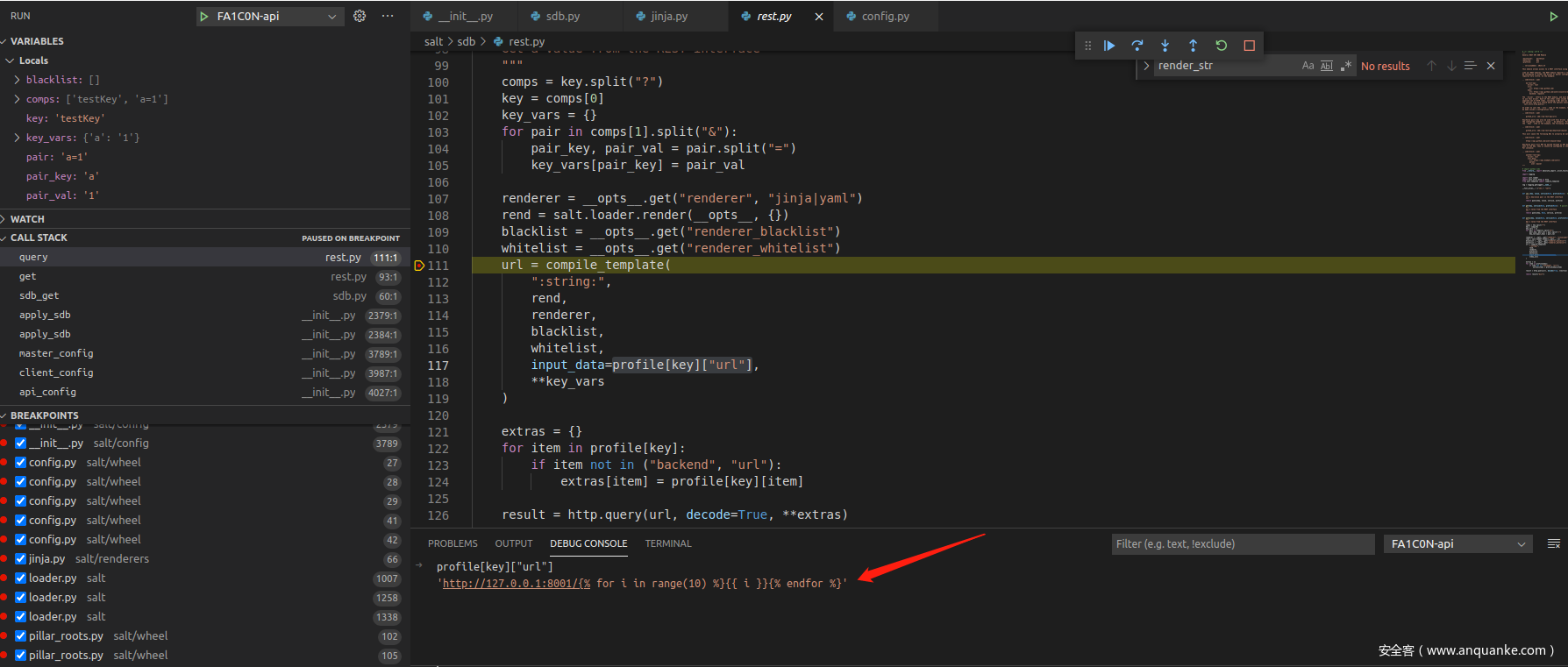query函数是将testKey?a=1解析后传入compile_template,断点位置的compile_template函数传入的input_data就是我们配置文件中写入的url值
