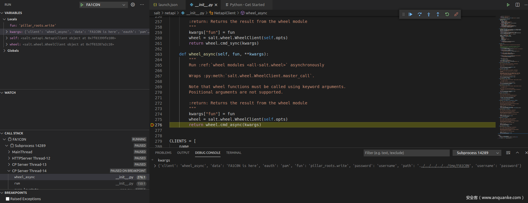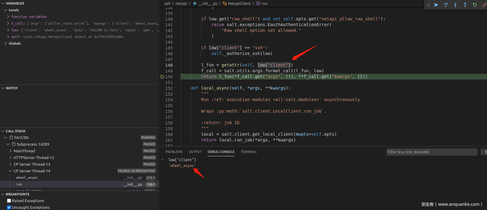 运行poc,首先断在salt/salt/netapi/init.py:NetapiClient.run()函数,可以看到run函数是通过getattr的方式动态调用传入的wheel_async函数,并将args和kwargs作为参数传入