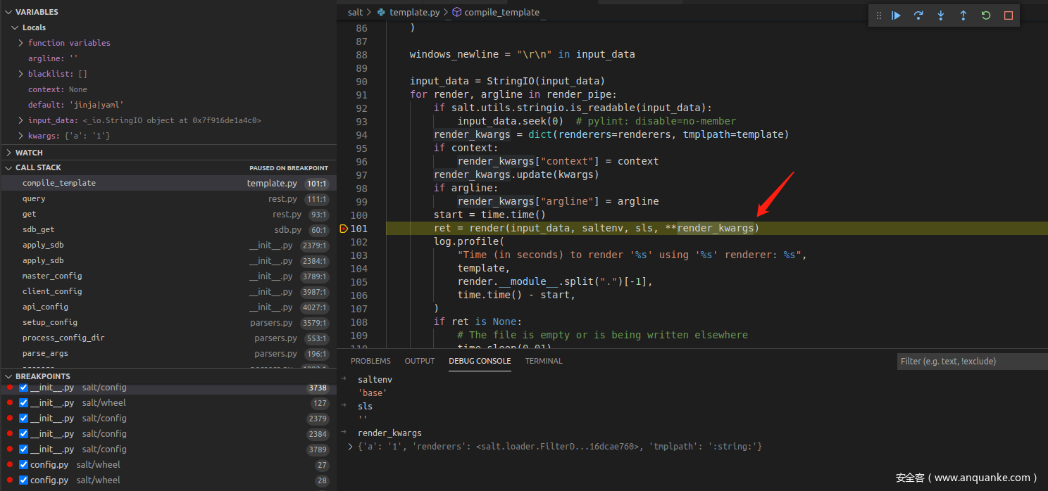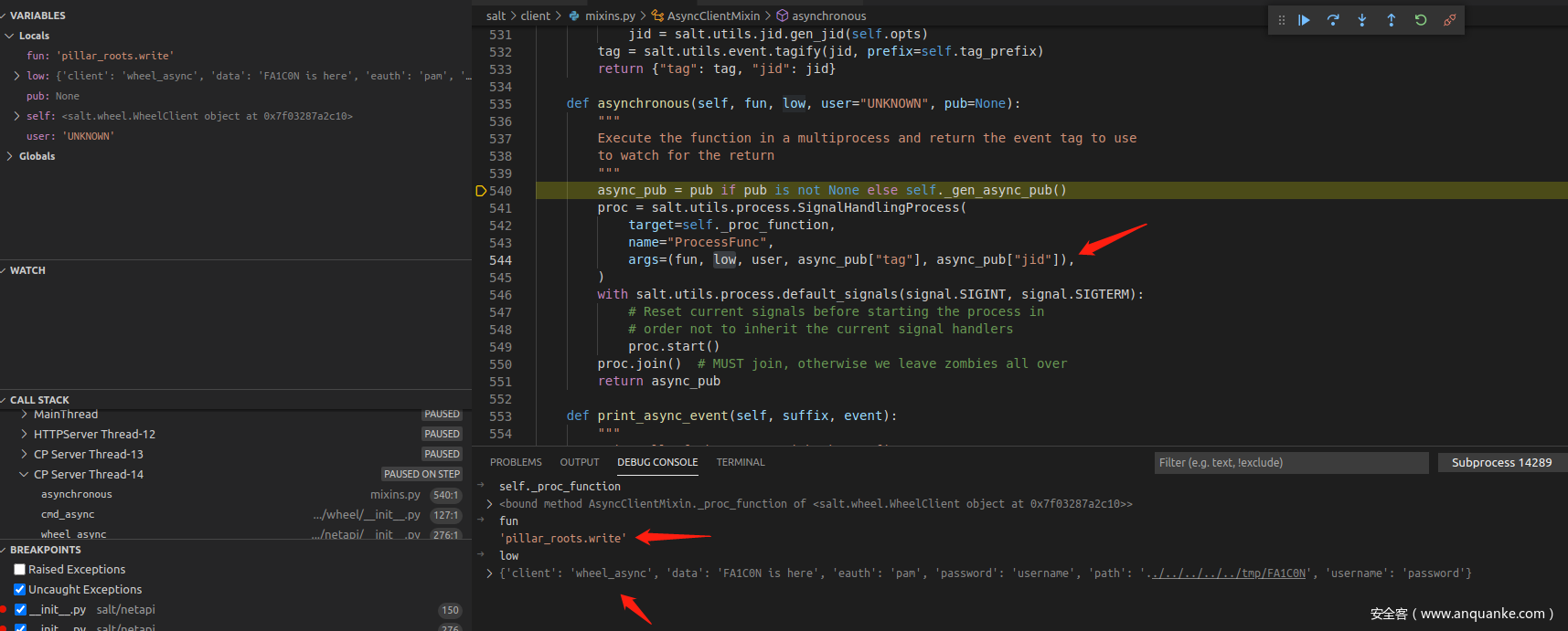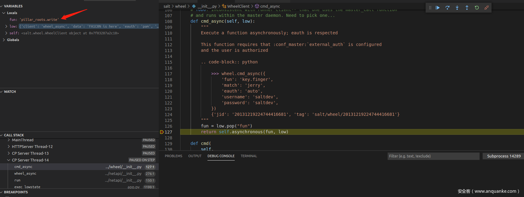 在salt/wheel/pillar_roots.py的write函数下断点,中途不存在什么过滤,完美到达写入位置。(注意由于salt是用的异步+管道的方式,因此能不能断到完全随缘是时候看看自己是不是有欧洲血统了)
