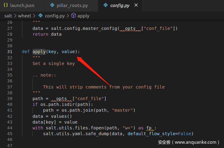 由于config.apply的调用跟pillar_roots.write一样都是通过wheel_async调用,断不断到完全随缘,因此我们这里用一个取巧的方法间接debug康康。