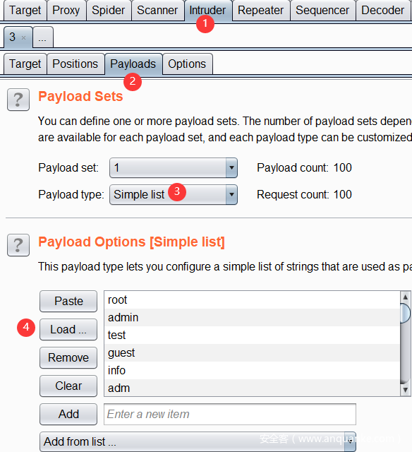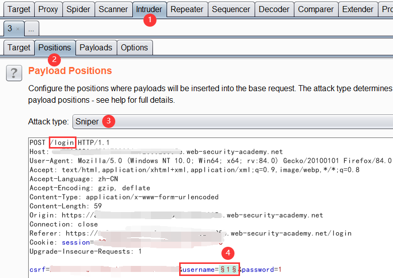 首先我们把登录请求包发到Intruder中,然后将用户名值设置为payload位
