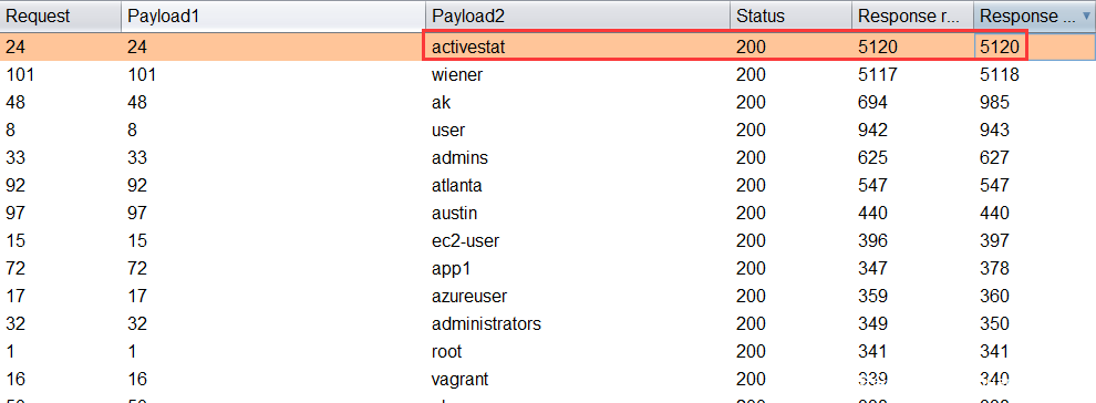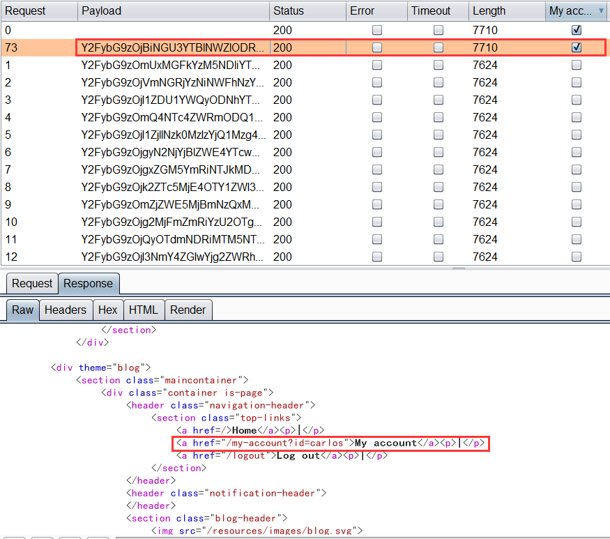 嗯?为什么有两个账号,因为另一个是burp给的测试用户,不然我们怎么知道用户名正确的时候响应时间会相差很多呢,爆破到用户名了,我们直接利用之前的方法爆破密码就能登进去了,因为burp的靶场目的都是为了让大家理解漏洞,所以都是比较浅显易懂的,没有任何弯弯绕,所以这里的用户密码都是一定在burp给的用户名和密码字典里的