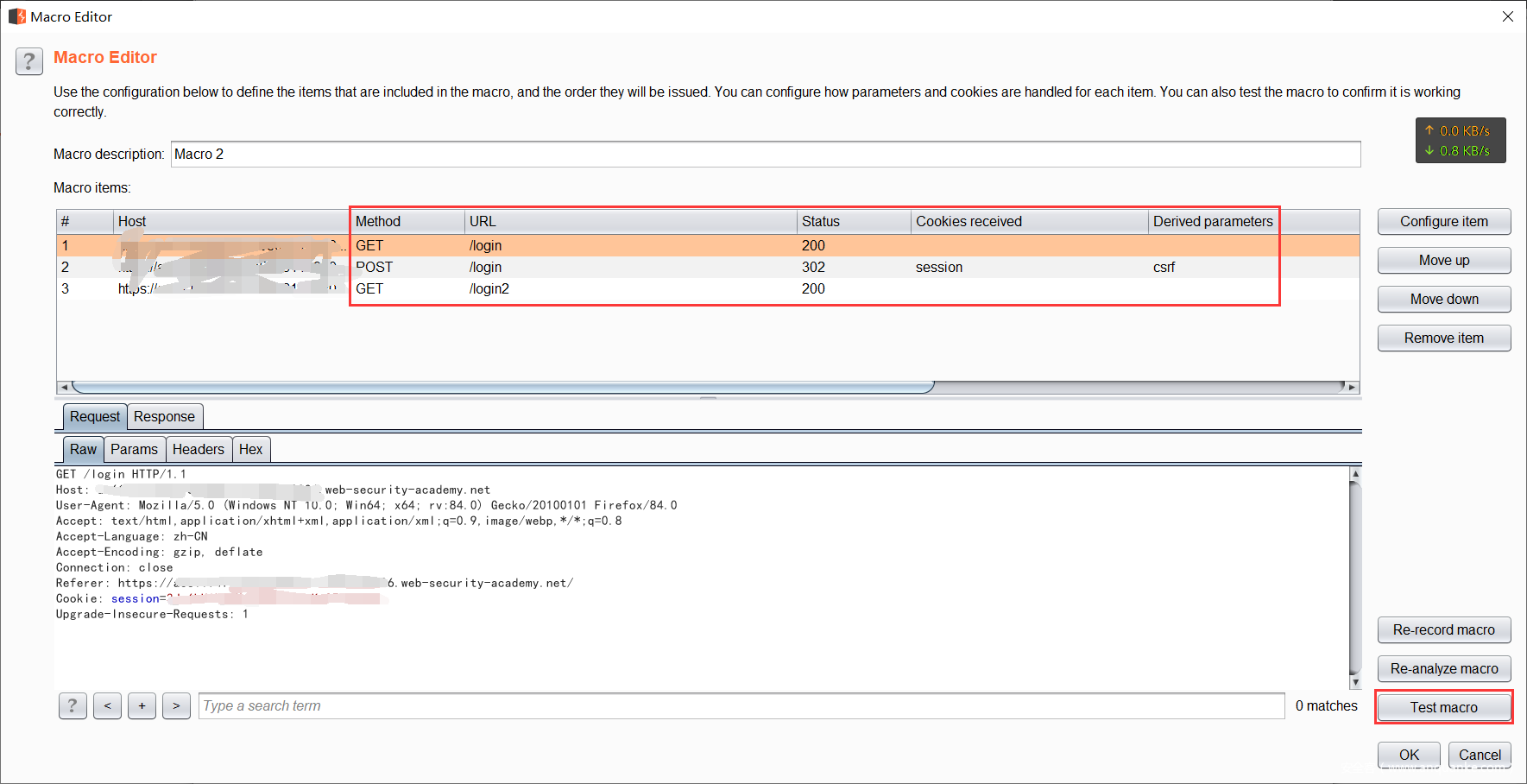 比如有的应用程序会在多少次失败的验证码尝试后自动注销用户,但是!对,burp又来了,burp在这里介绍了一款大杀器,Macro,翻译过来就是”宏”,就是可以”录制”一系列的请求序列以实现多步骤暴力破解攻击