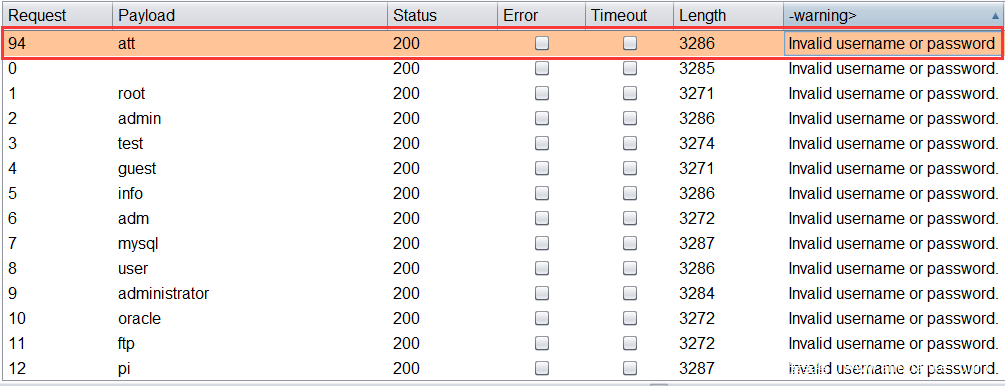 我们看到提示密码错误了,这就说明用户名是正确的,于是我们接下来爆破密码,步骤与爆破用户名类似,故忽略,爆破到密码以后,打开响应包就能看到已经成功登录了