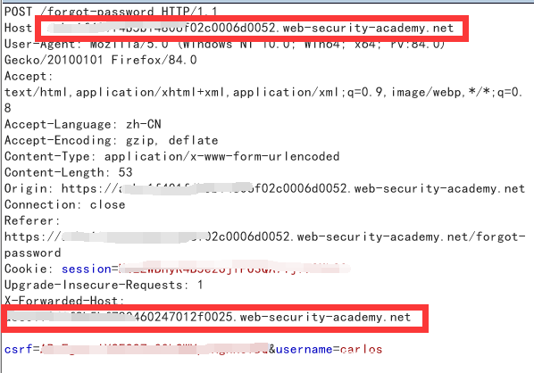 我们发现重置密码会将密码重置Token发送Host字段指定的邮箱中,但是我们修改Host为我们的服务器的域并不生效,于是我们可以添加这样一个字段X-Forwarded-Host字段,然后它的值就是我们服务器的域,发现我们接收到了本来应该发到受害者邮箱的密码重置Token,于是我们拦截重置密码请求包,将用户名修改为目标用户