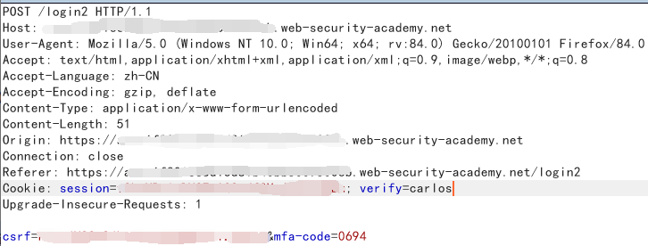 前面讲了,双因素身份验证也是有缺陷的,这里burp介绍了一种情况,就是验证用户名和密码、输入验证码是两个步骤,当用户名和密码通过验证以后,此时其实用户已经是处于登录状态了,所以我们就可以跳过输入验证码的环节直接进入用户界面