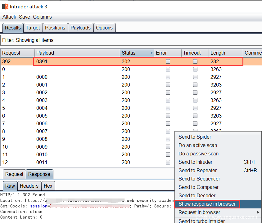 然后我们开始爆破,10000种组合还是要久一点的,耐心等待一下,然后成功爆破到以后,用之前介绍的方法在浏览器打开响应包,发现已经成功登录目标用户而不需要知道它的密码和接收验证码邮箱的使用权