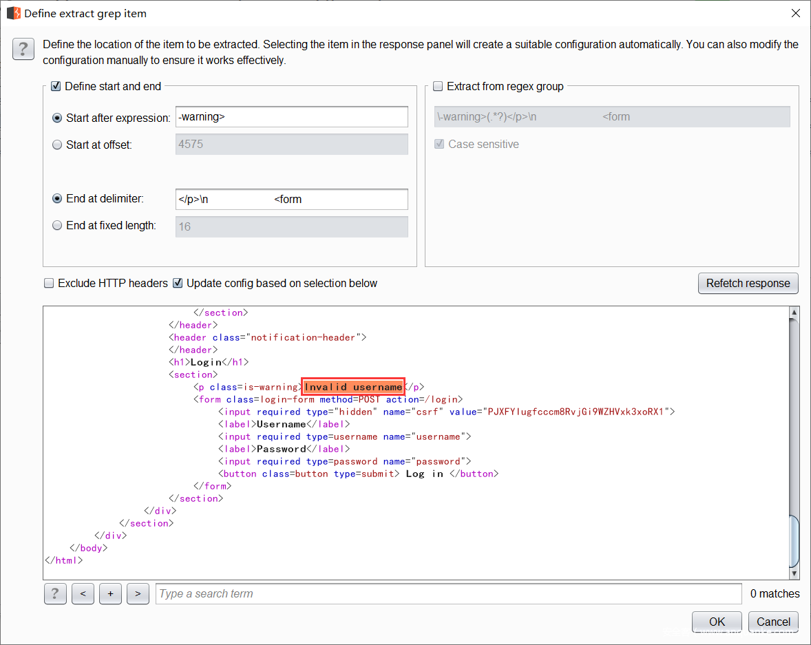 然后因为用户名错误还是密码错误的响应状态码是相同的,但是响应包正文会有一点差异,所以我们利用正则功能自动提取爆破结果中的特征值