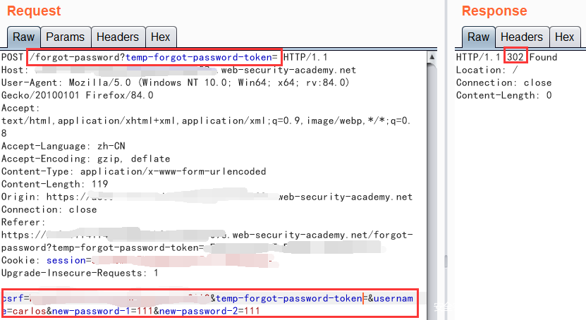 就像我们上面讲的,我们触发一个重置密码的请求,然后清空Token的值,然后将用户名修改成目标用户,密码修改成简单的弱密码,发现也是可以触发跳转的
