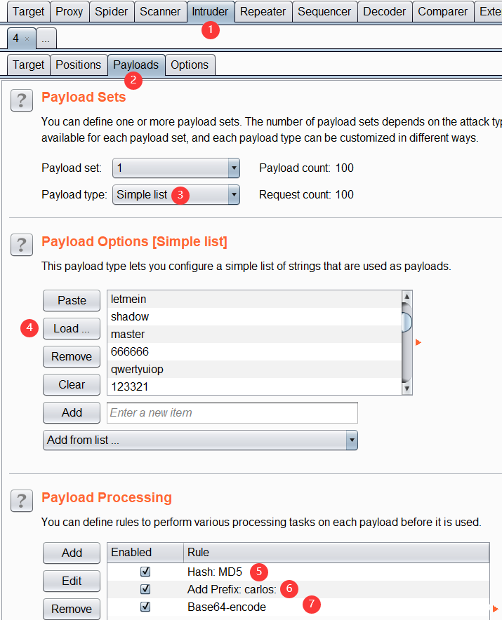 我们看到我们的猜测是正确的,发现解开以后是用户名和疑似密码md5值的组合,既然这样,我们就假设我们的猜测是正确的,然后我们将这个请求包发送到Intruder中,对payload做以下变换