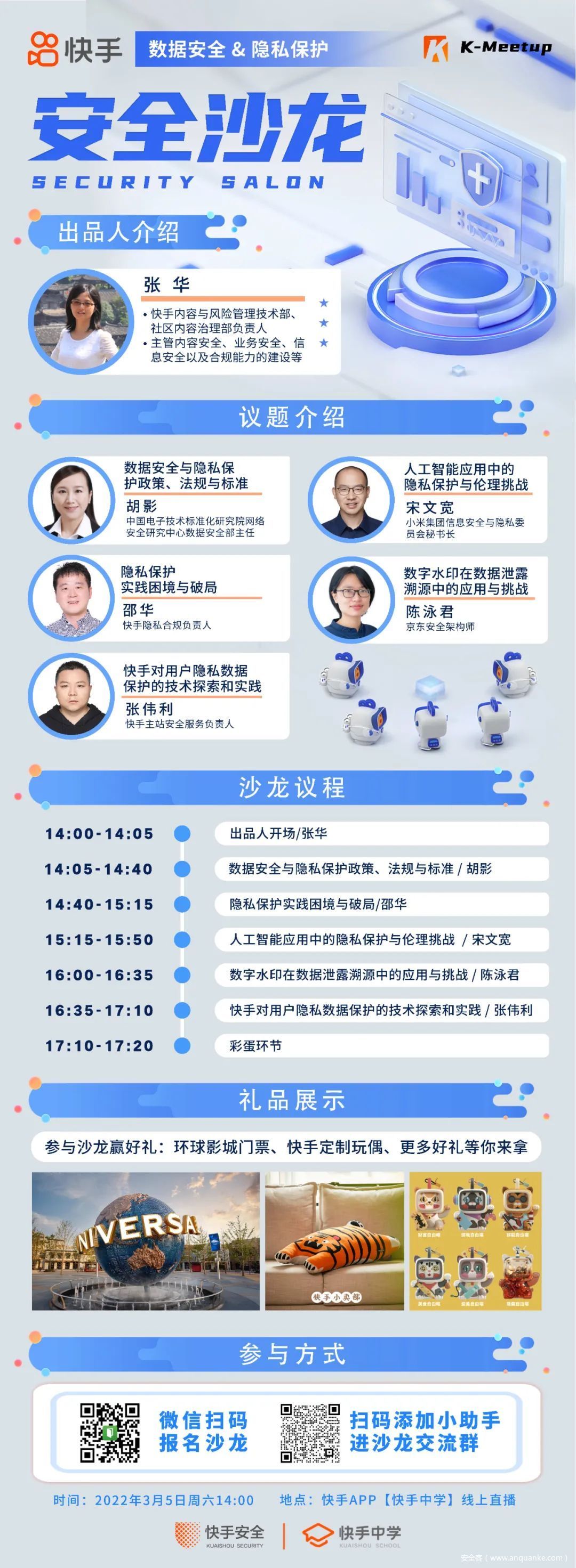快手安全「手」护者系列沙龙于2021年5月首次举办,至今已成功举办三期。以沙龙活动的形式搭建技术交流平台,探讨未来技术演进的方向,互相交流企业实践经验,提升技术视野,助力技术人才成长,促进企业生态建设与蓬勃发展。本期联合快手中学团队,举办数据安全&隐私保护专场沙龙。