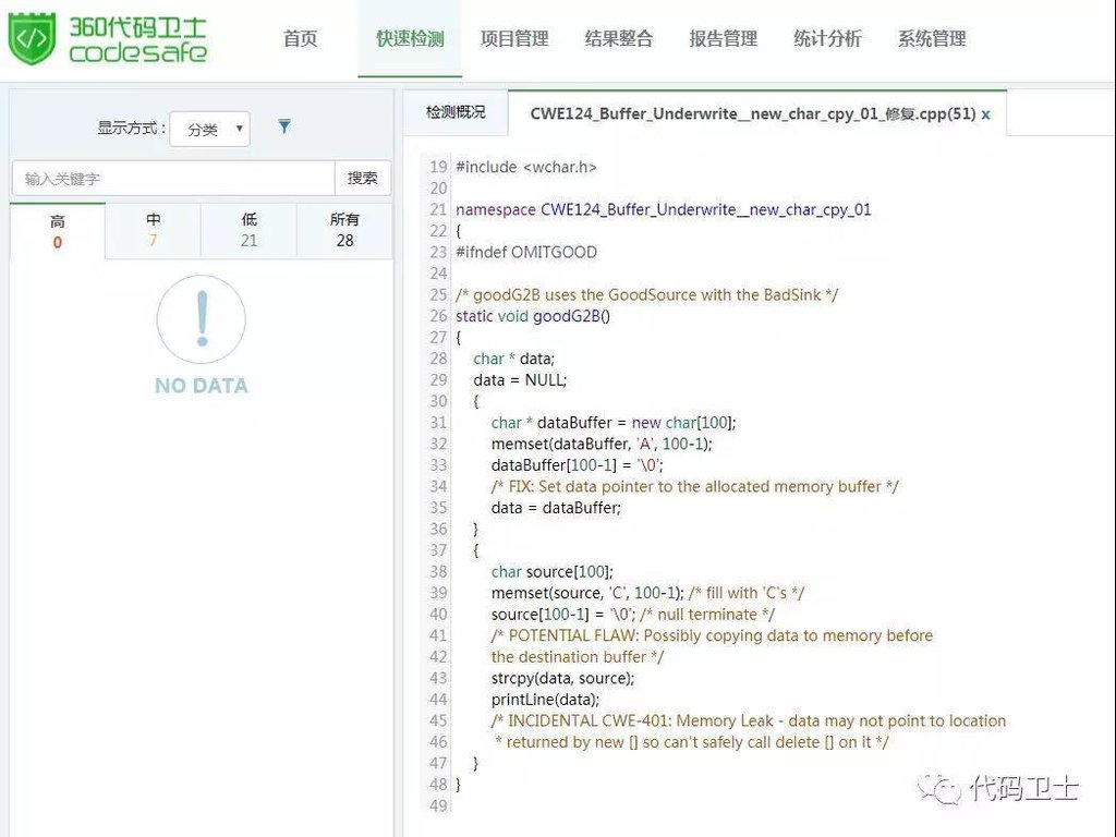 使用360代码卫士对修复后的代码进行检测,可以看到已不存在“缓冲区上溢”缺陷。如图2: