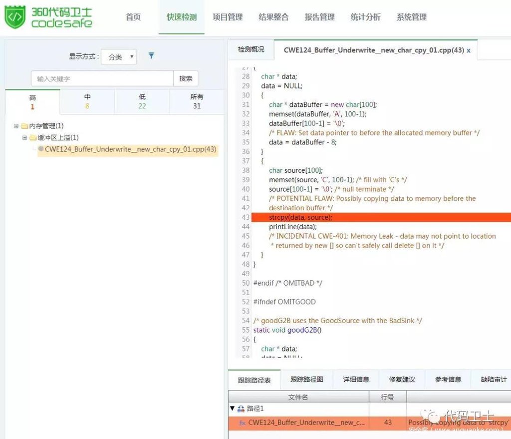 使用360代码卫士对上述示例代码进行检测,可以检出“缓冲区上溢”缺陷,显示等级为高。如图1所示: