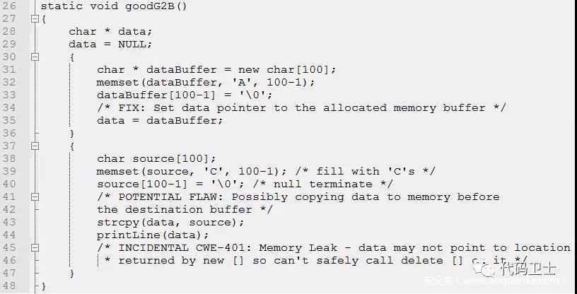 在上述修复代码中,Samate 给出的修复方式为:在第35行对指针 data 进行赋值,将 data 指向 dataBuffer ,此时 data 的长度与 dataBuffer 一致,当第43行进行拷贝操作时,源缓冲区与目的缓冲区长度相同,从而避免了缓冲区上溢的问题。该问题也可以通过对边界进行检查来进行修复。