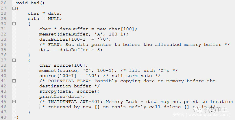 示例源于 Samate Juliet Test Suite for C/C++ v1.3 (https://samate.nist.gov/SARD/testsuite.php),源文件名:CWE124_Buffer_Underwrite__new_char_cpy_01.cpp