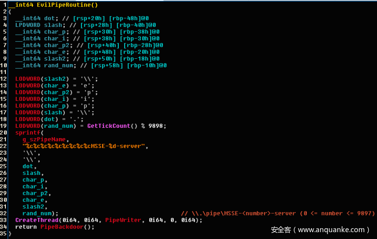 1、定义一个本地命名管道,格式为\\.\pipe\MSSE-<number>-server,其中<number>为0到9897之间的一个随机数;