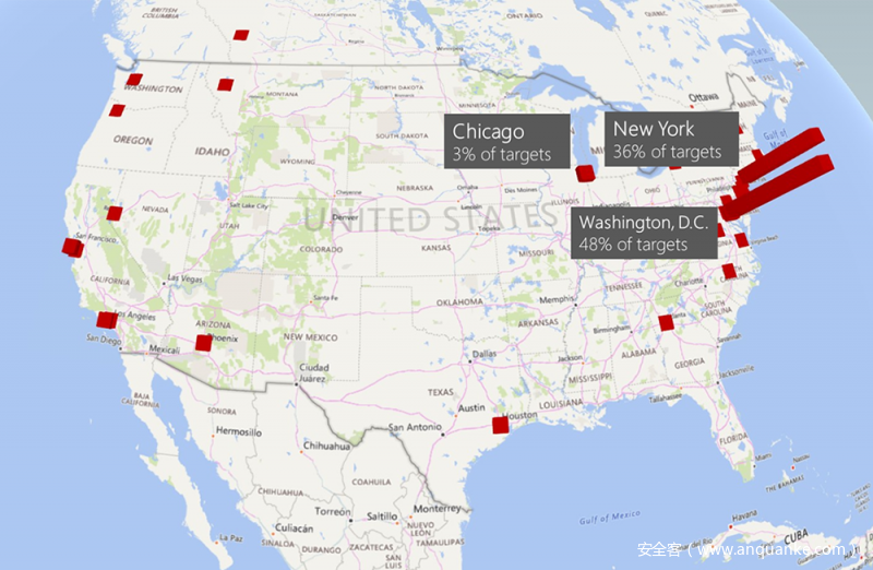 虽然攻击目标遍布全球,但主要集中在美国,特别是华盛顿特区及周边区域。其他目标还位于欧洲、香港、印度以及加拿大。