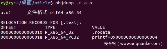 此时再查看重定位表,.rodata存放的是字符串常量“hello world! ”,RELOCATIN RECORDS FOR[.text]表示代码段的重定位表